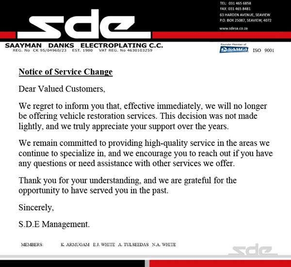 Saayman Danks Electroplating provide a diverse range of metal finishing services specializing in electroplating and anodizing. We supply various industries including the automotive, shop fitting, food and electrical industries.